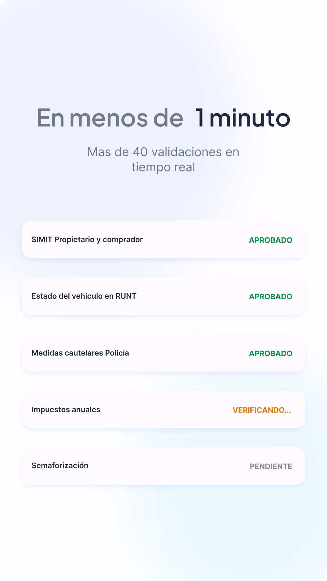 Te mostramos si tu trámite tiene algún bloqueo, como multas, requerimientos en el RUNT, embargos y demás. Realizamos más de 40 validaciones en tiempo real.